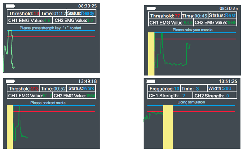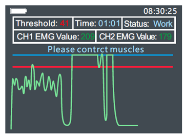 Wenn der Patient einen bestimmten Schwellenwert des EMG-Signals erreicht, wird ein Stromimpuls (EMS) abgegeben, der eine Kontraktion auslöst oder die Stärke der natürlichen Kontraktion erhöht. Sobald diese Stimulation beendet ist, sollte der Patient diese Kontraktion selbständig aufrechterhalten. Wenn geschwächte Muskeln behandelt werden sollen, sollte die Ziel-EMG-Signalschwelle niedrig angesetzt und die Arbeits- und Ruhezeiten entsprechend angepasst werden.
