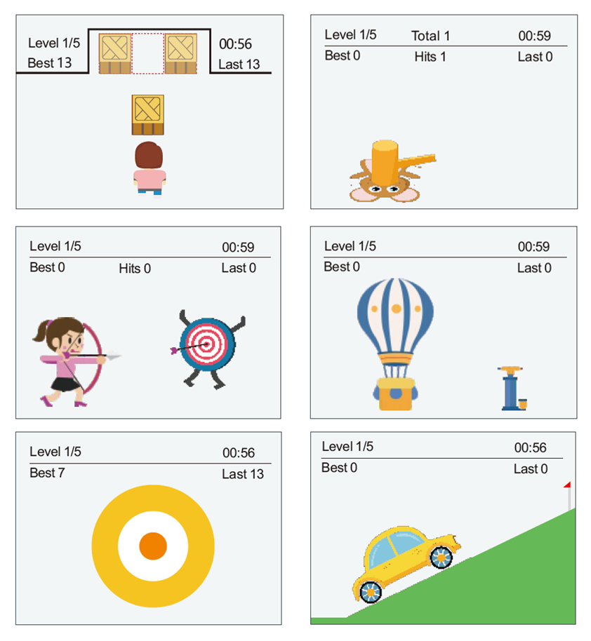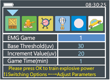 - EMG-Spielmodus - dies ist ein aktives Training, bei dem der Benutzer die Muskeln des behandelten Bereichs mit Hilfe von Animationen aktiviert. Es gibt 6 Spiele, aus denen der Benutzer wählen kann.